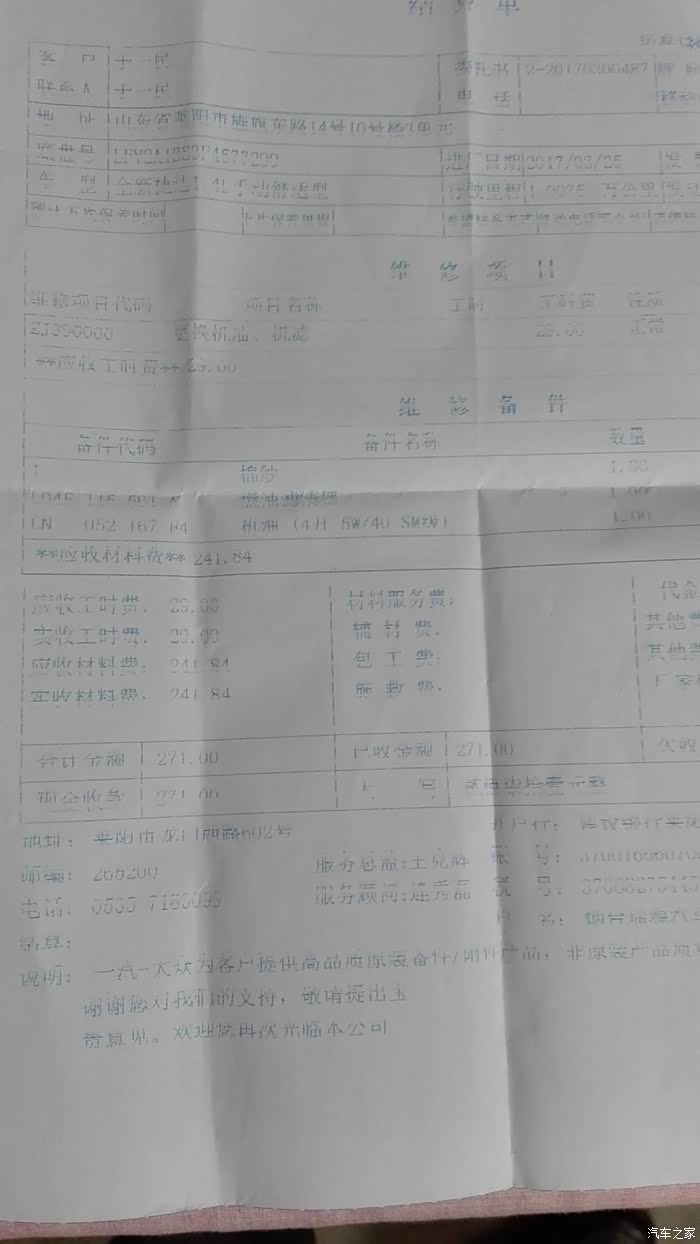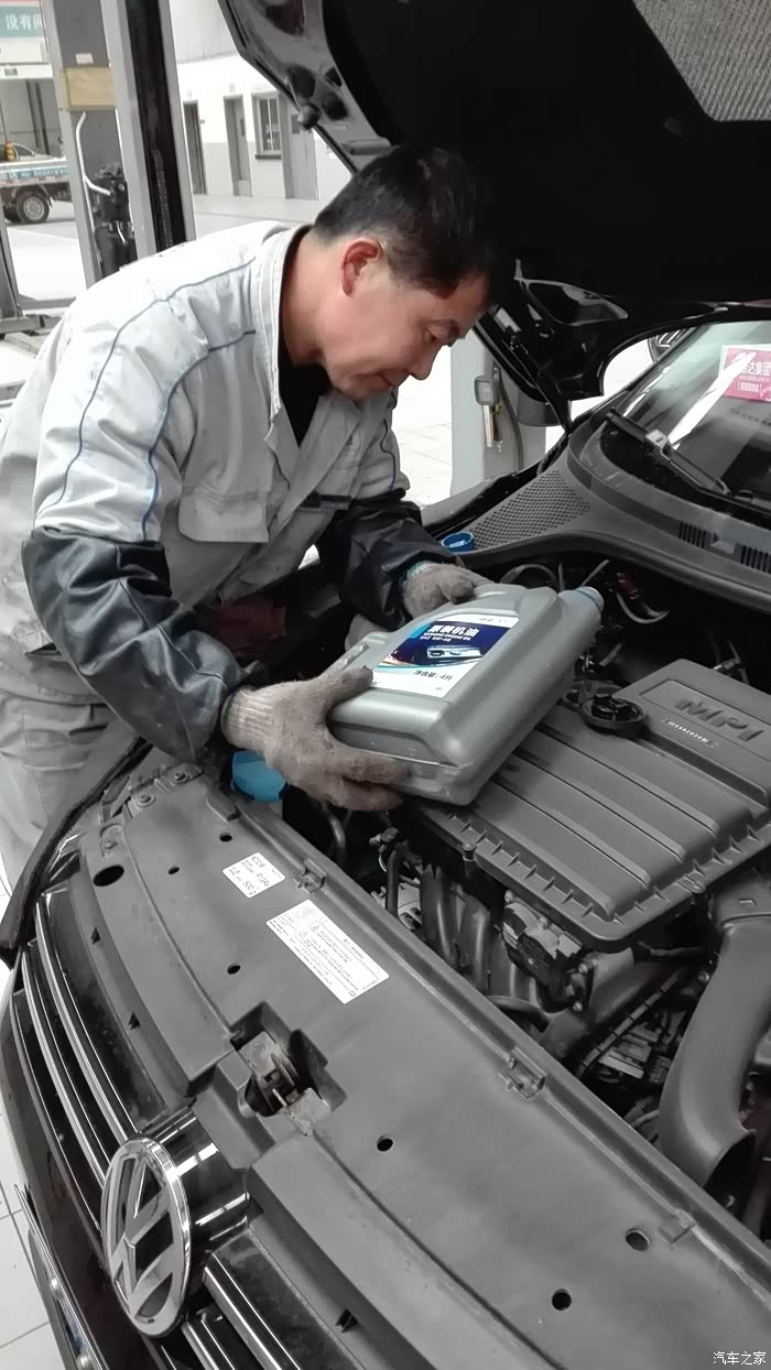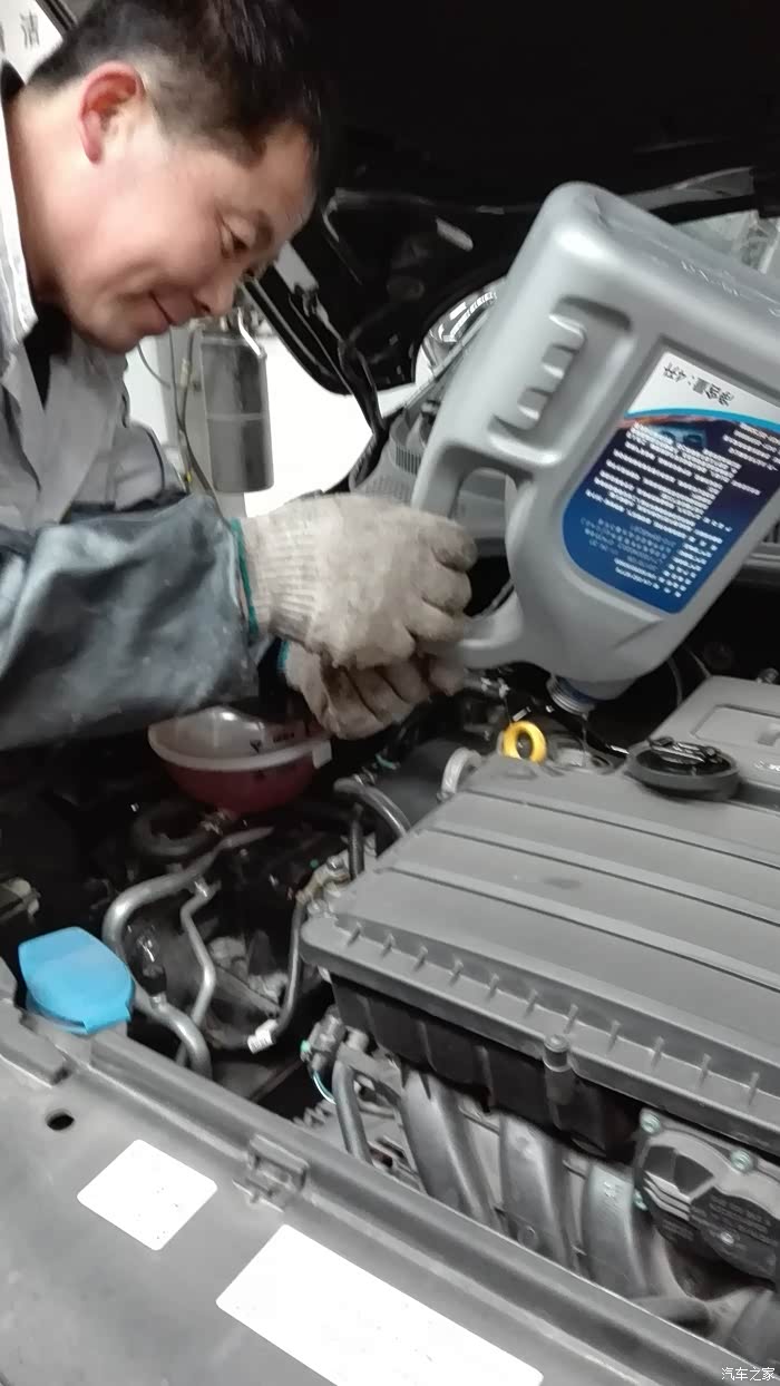 15年8月提的新捷达,5000公里首保后,现在已经行驶10035公里,决定去做二保。去4S店换了灰桶5W--40半合成机油190.01元,机滤50.83元,工时费29元,共花了271元,本人总体感觉挺满意的,价格也在能接受的区间。尤其是烟台瑞源4S店的房贤坤师傅,态度和蔼,服务热情,技术精湛,讲解到位,很是让我感动、敬佩。换完机油、机滤后,又给检查了4个轮胎的气压,清洗了空气滤清器和发动机舱,检查了防冻液和刹车油,并根据我在捷达论坛上看到的半轴漏油及发动机和变速箱结合部漏油的情况,将车辆吊起来,给我指出半轴的位置,发动机和变速箱的结合部位置,并耐心细致的进行了检查,没发现漏油的地方。最后又检查了灯光,清洗了花粉滤清器,将保养周期显示复位。