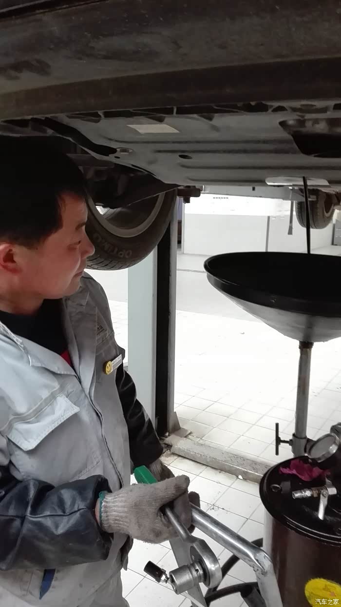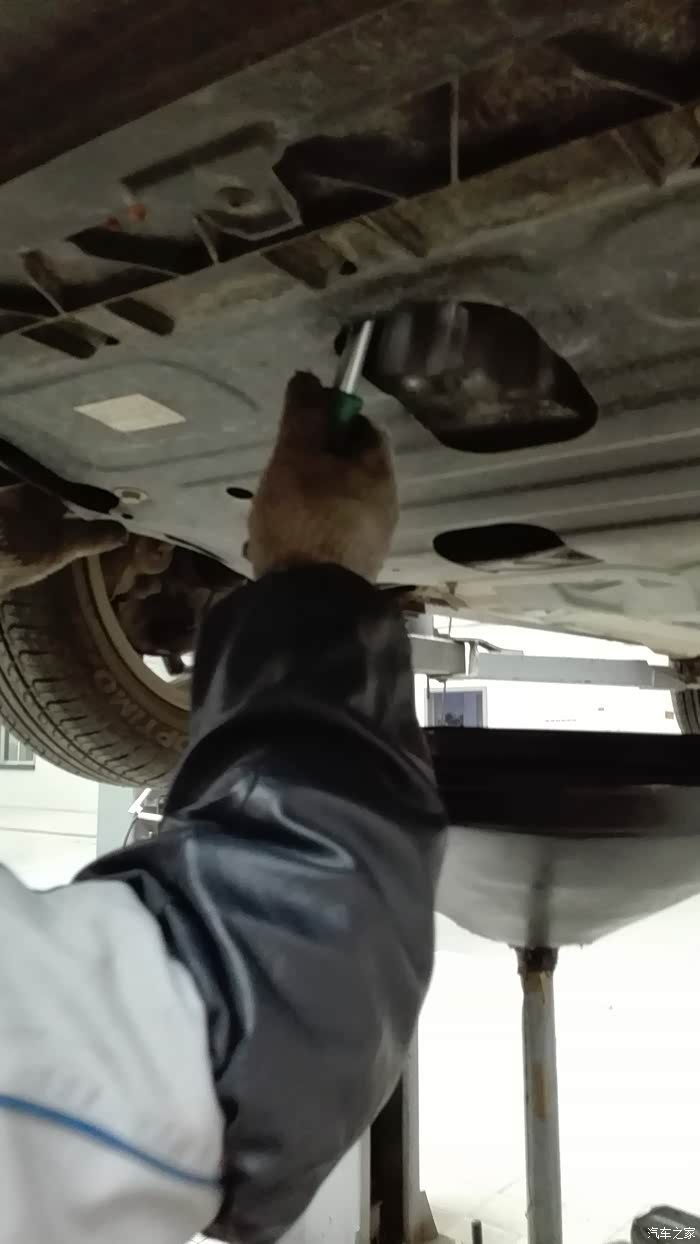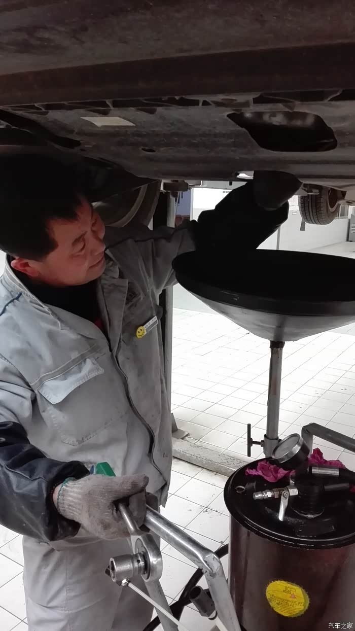 在放旧机油。放油前看了机油尺,基本上已到下限。