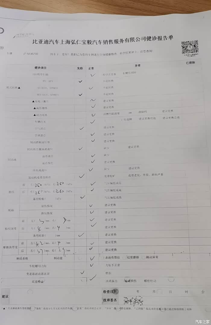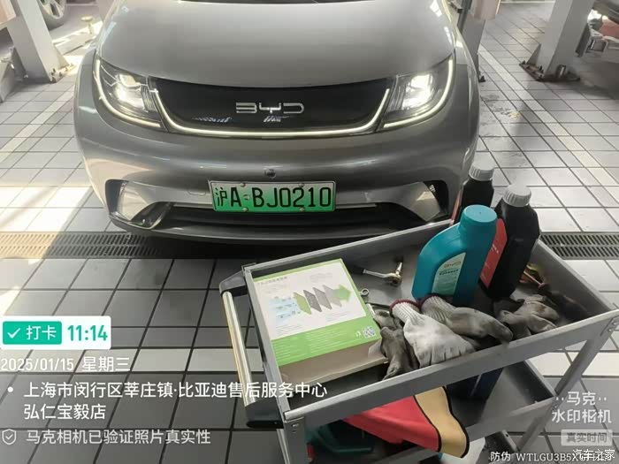 过来保养一下,因为春节前要回老家,需要开长途,特意跟售后服务人员交代一定要把车子检查好,安全问题不容忽视,这次过来做个大保养把刹车油,变速器油,还有防冻液,空调滤芯都换了一遍。纯电obd检查了一遍。售后师傅非常认真!感谢比亚迪闵行区的弘仁宝毅工作人员,辛苦啦!