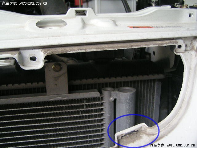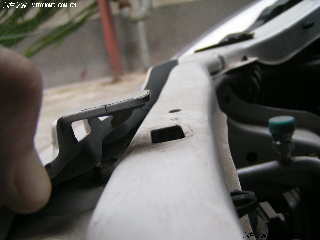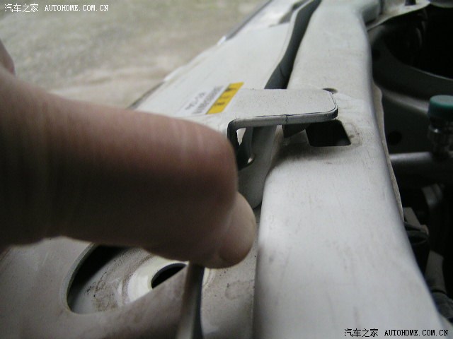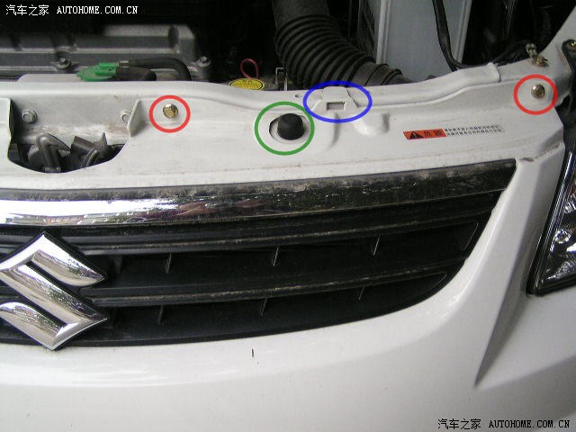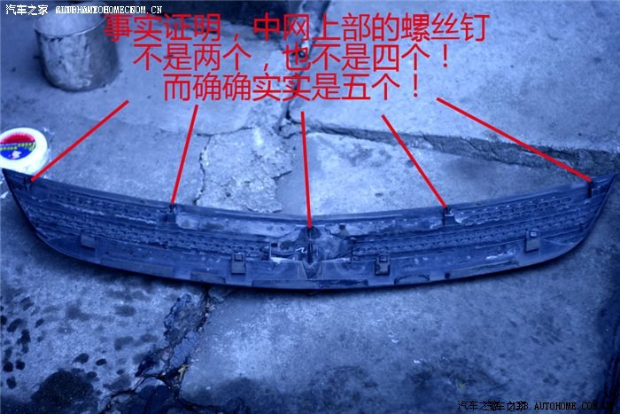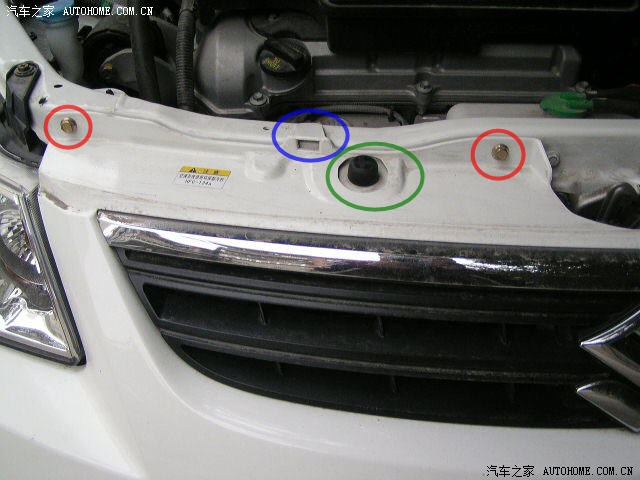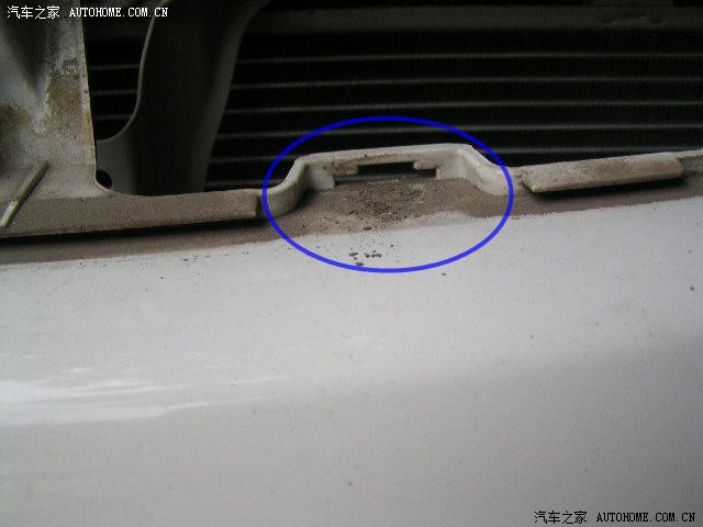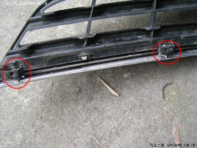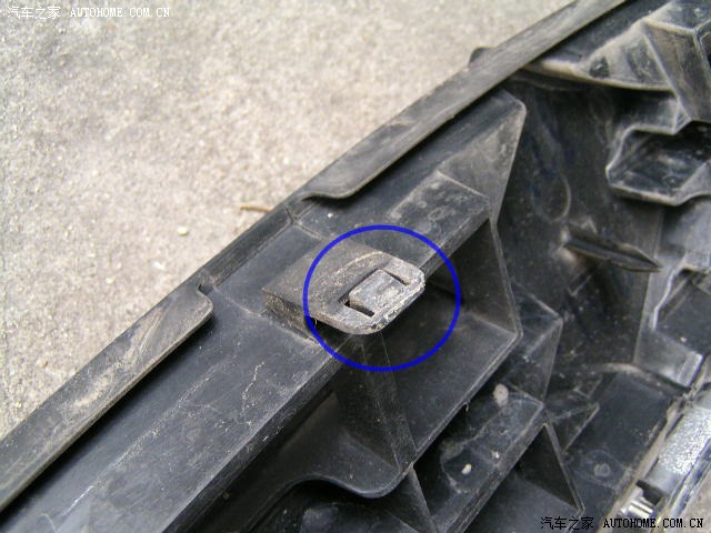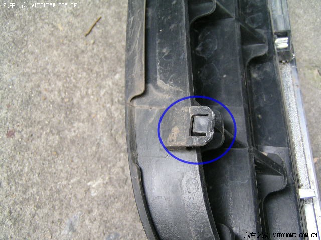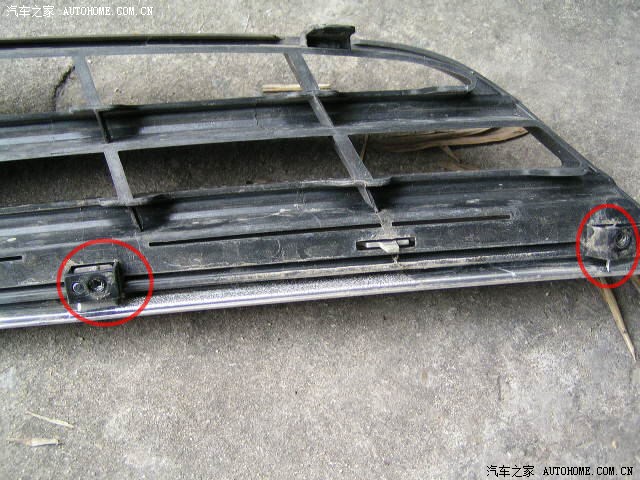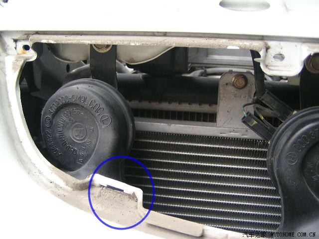 中网下部横向4个卡扣对应的卡槽图(篮圈标注的,同时也看到了原车喇叭。图片多点,多看看好些。呵呵):