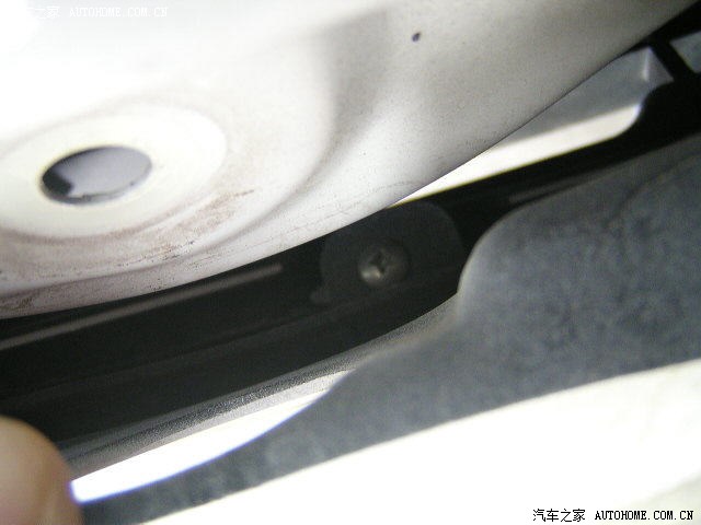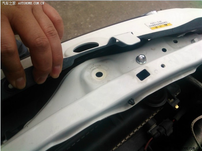 2、前保险杆的上面可以掰开一些空间,可以看到里面中网的固定螺丝,一共5个,十字螺丝刀取之。这里注意用带磁性的工具,以免螺丝掉到下面去会很麻烦的。