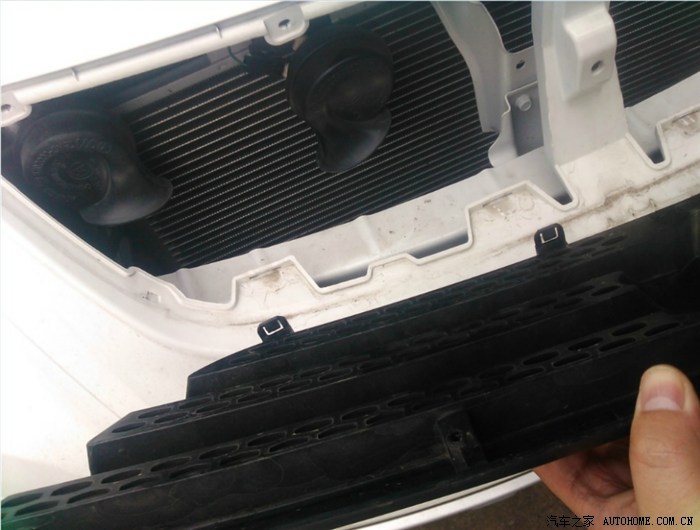 3、取下五颗螺钉后,伸手进去,中网下部是横向4个卡扣,依次一摸、二稍向下按、三向前推出。中网就可以取下了。