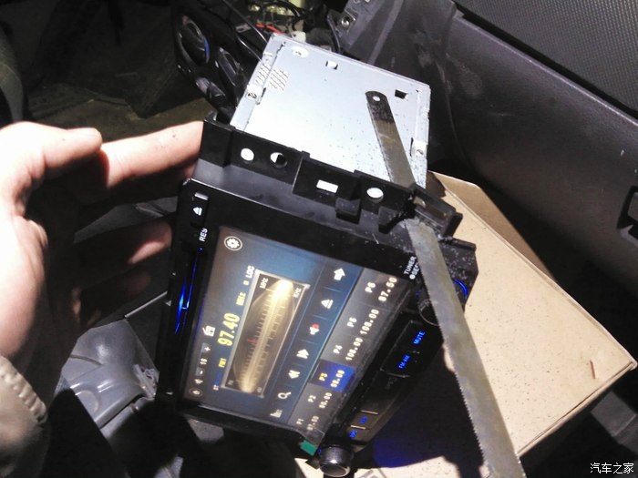 接下来导航一体机安进去,上下空间没有阻碍了,到两边,两边所有顶住的东西都锯掉。看下图: