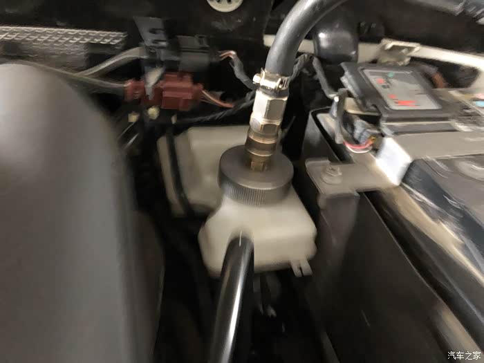 抽油的小壶管子与刹车分泵的管子连接抽取刹车油,一边抽刹车油,上面的那个机器一边往里输送新的刹车油,直到旧油完全排出。