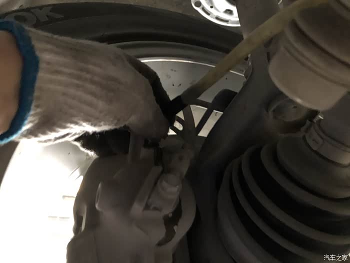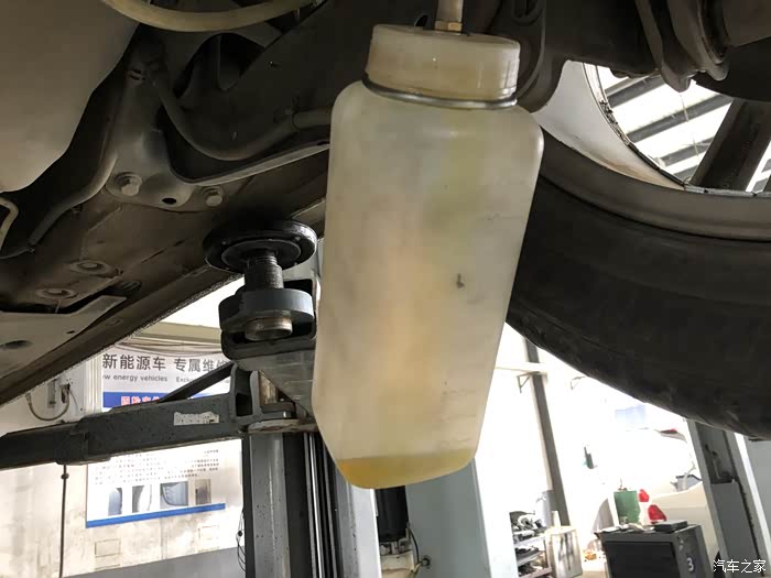 然后用一个小的容器去每一个刹车分泵上把刹车油放出来