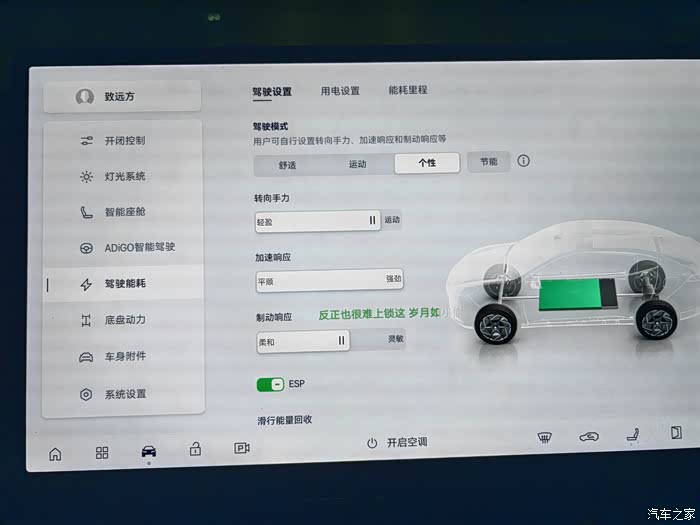 这三种模式各有特点,舒适模式提供了平稳的驾驶体验,运动模式则提供了激进的驾驶感受,而极致节能模式则在保证正常行驶的前提下,尽可能地降低能耗,适合不同的驾驶场景和驾驶者偏好。如果你对这些预制好的驾驶模式都不满意,此外昊铂HT还提供了可以自由调整的个性模式,这也是让我非常喜欢的模式,我可以按自己的喜好的方式调整加速、方向盘力度、刹车灵敏度、动能回收的大小,每个人都可以调出一个适应自己的驾驶风格的个性模式,非常实用的功能。