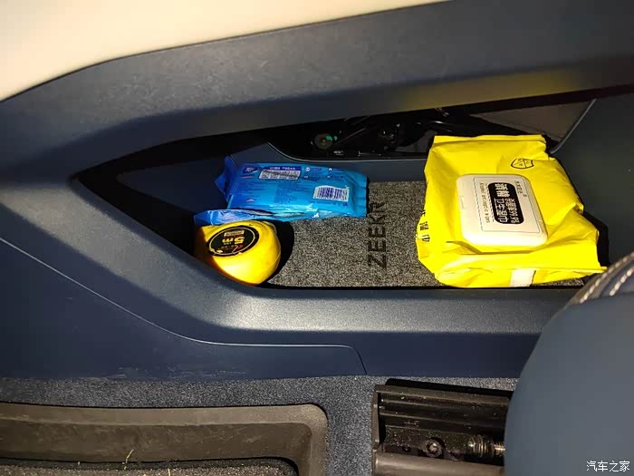 这个位置可以说是新能源车的一个特色之一,以前因为油车的原因所以这个位置有变速箱无法利用,现在是新能源车型,没有变速箱了,所以有这个位置可以利用。这个位置看着是够大,但是两侧的高度不足,所以我放了点小东西,湿巾一大一小各一包,一把卷尺,湿巾的用处非常大,有时候可以处理一些车身上的鸟粪或者赃物,至于你问我卷尺干嘛?它是我用来收集素材的帮手哦,我经常用它来测量一些极氪001使用过程中的数据。