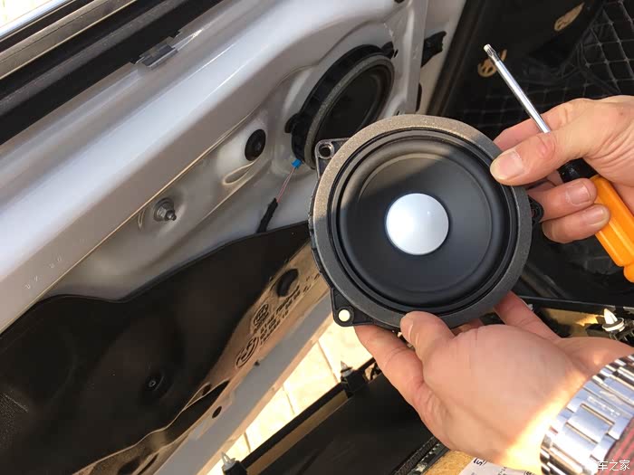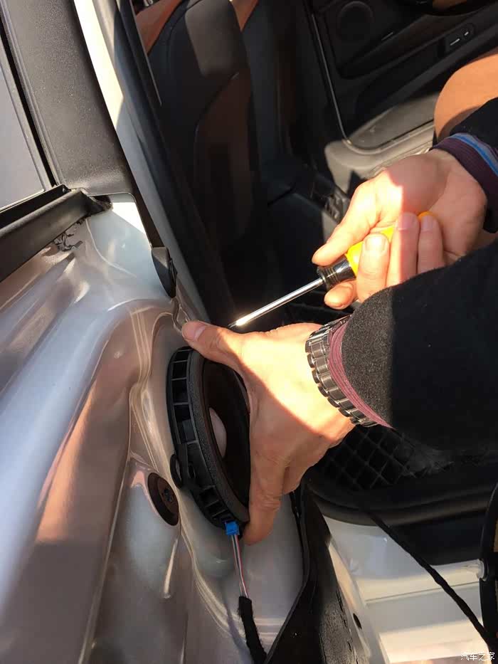 拆门板,跟拉手一样,多点撬,先撬松,然后用手拉出即可,然后装哈曼中音喇叭,取下拉手螺丝后,撬门板,如果直接用手扳就好了,注意检查一下卡子别掉了,我是找了一个人帮忙扶门板,这样做的好处就是门板上的线全部不用拔掉!