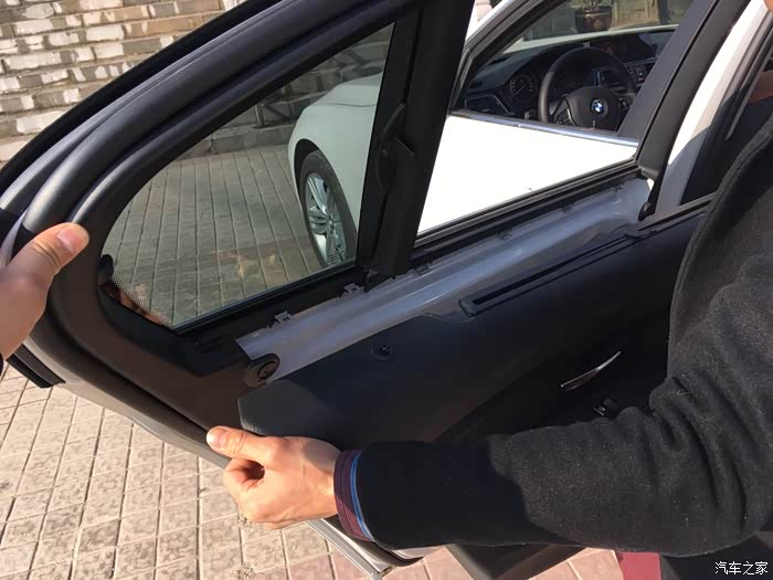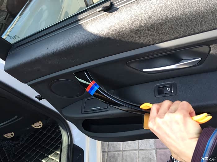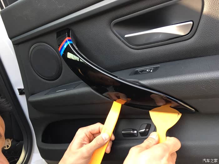 首先拆门板,其实没有那么难,首先把门板拉手撬出来,拉手下面设计了撬的孔位,这点宝马做得很好,记得别把拉手弄花了,适当保护一下,撬的时候不要一步到位,得多撬几个点,用巧力!