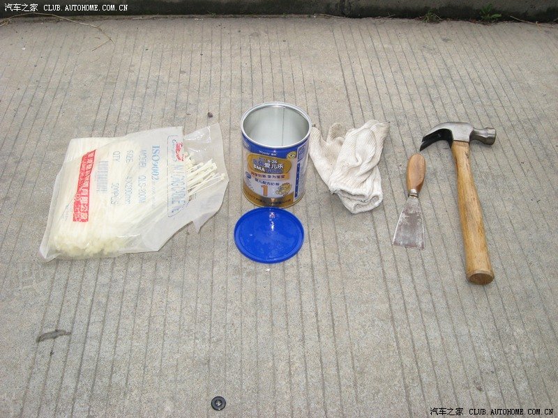 工具:依次是1、自紧扎带,安装好后可以固定.2、我家小丫头的奶粉罐,她太挑食,只喝奶粉,不吃罐子.浪费啊,于是我拿来装肥皂水,润滑胶圈与弹簧.3、手套。4、油漆刮刀,5、榔头。这个地方解释一下为什么要用油漆刮刀,悦动的后弹簧用的B号胶圈太长,要割掉一点,否则会互相技压,装不上去,我家的美工刀刀片太软,没法割这么厚的橡胶。手头只有这个油漆刀了,也为后来的受伤留下了隐患~~~~。5的榔头不是用来敲的,车附近没有砖头,就用榔头顶在车头轮胎下,防止千斤顶把车升起来后滑动。