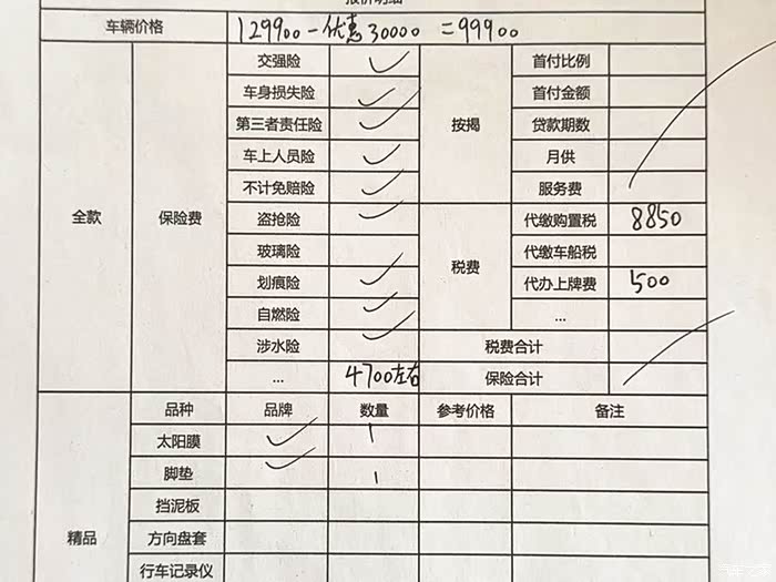 很多人以为谈价格的时候是最难的,其实现在谈价格还是非常简单的。现在在我们这个地区属于限价保护,也就是说,去任何一个4S店,他们的销售优惠价格,包括补贴,基本上都是一致的。所以说在价格方面,基本上差别并不是很大。下面就给大家简单分享一些车辆的价格吧。(裸车价:129900、现金优惠:30000保险:4650、购置税:8850、上牌费:500、落地总价:113950)赠品基本就是脚垫和贴膜,不过送的都一般建议加点价格换好一点的。这就是今年的价格了所有的店基本都差不多所以我觉得转个两三家店就足够了。