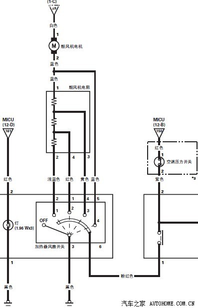我的车没清洗空调,也出现了烧电阻的问题(1、2、3档无风),上个星期2去4S索赔,一个女的接待的,和她说1、2、3挡无风,她马上知道是烧电阻了,看样子这问题去修车的人还挺多的,然后她说要订货,电话通知你。我问道,这个应该是在索赔范围之内的吧,她说只要在3年10W公里内都能索赔(她没查我车辆保养信息)。我就一溜烟回家了。昨天电话打来说,我订的电阻和鼓风机到了(当时我要求她连鼓风机一起换了),吃完饭马上过去,结果是个男的接待我的,我和他说了事情的经过,他帮车开到修理间,然后去查我的车信息。说你的车1.5W后就没来保养了,这样的话不能索赔,总公司上交不上,如果少个几次可以帮你索赔,可现在都快6W公里了,所以抱歉。我说这个应该和保养应该没问题吧,应该是质量问题吧,他还是那句话,那修修要多少钱。风机890+电阻430+100工时,靠要1400多,你还是留着自己用吧,既然不能索赔,好的以后出险也不来你们4S了,88,说完我就一溜烟回家了。之前看了看电路图,电阻其实很简单的东西怎么会出问题呢,所以今天决定拆开看看,好了接下来看图说话。