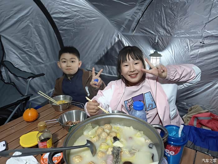夜幕降临,我们的朋友一家也是摸黑开上了山路赶来了。我们一起在帐篷里开启了火锅派对。两个小孩子兴奋不已,在帐篷里嬉笑玩耍。锅中食材翻滚,香气四溢,大家围坐在一起,一边享受着美食,一边分享着生活中的趣事,温馨的氛围弥漫在整个帐篷里。