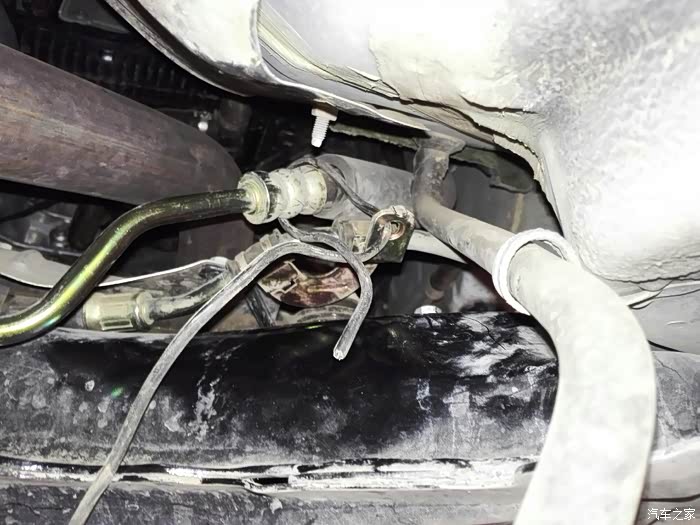 这三根管下面的是进油管,右侧的是空调出水管。由于工作面太小,我把固定螺丝卸掉后直接用电话线从卡子的螺丝孔穿过去,捆绑在回油管上。