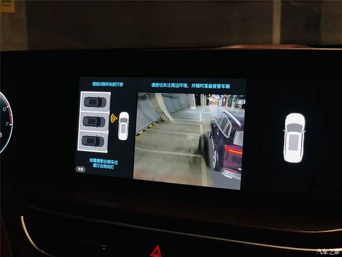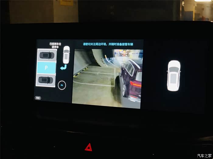 进到地库,发现车子并不算多,本身出来逛商场也不着急,我就想着试一下自动泊车吧,开了一年多了,可还没有体验过呢!实际上一开始我还摸不清操作,试了两次才搞清楚,原来找车位时要同步打开转向灯,打左边就找左侧的停车位,打右边就是找右边的停车位,找到后选中要停的那个车位,然后再根据中控屏上的提示,先挂入R挡踩住刹车,然后松开刹车和方向盘,由行车电脑接管车辆开始自动泊车。