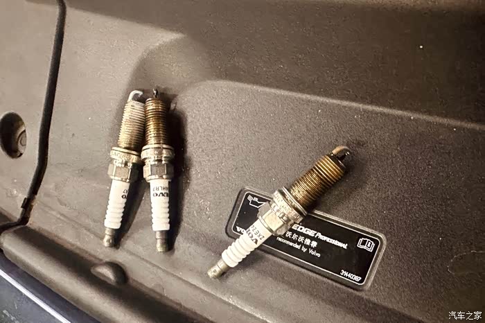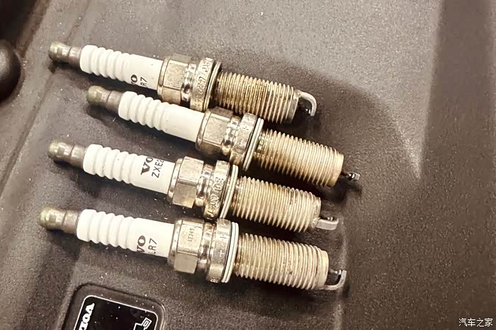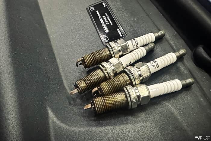 取出来的火花塞~2021年11月更换的,这一年多基本是短途低速行车,偶尔的高速也只有几百公里,上面附着一点积碳,应该不算多,但是汽缸内估计应该不少了