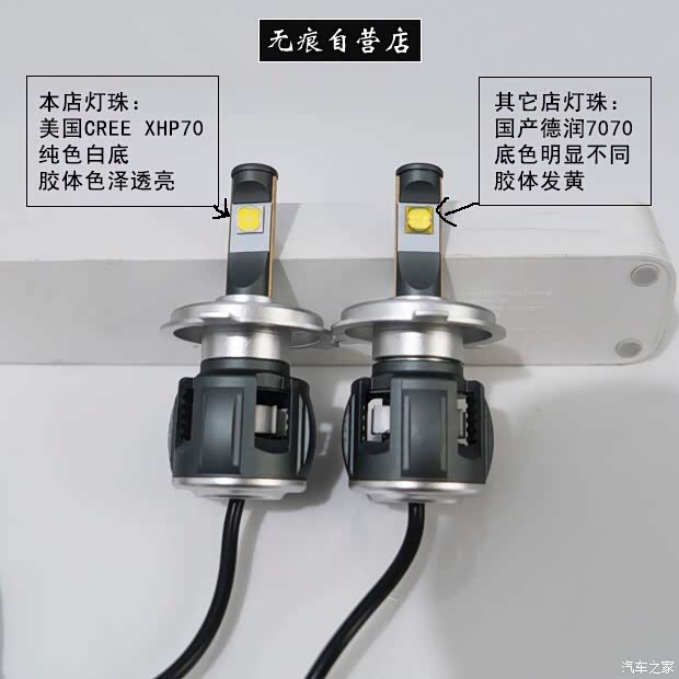 终于找到一款和无痕卖的同款灯泡,无痕卖330,这家只要150,看上去一模一样,都准备下单了。又仔细研究了下,无痕卖的大灯灯珠是美国CREE XHP70,同款却是德豪润达国产7070灯珠,从外观就可以看出来。