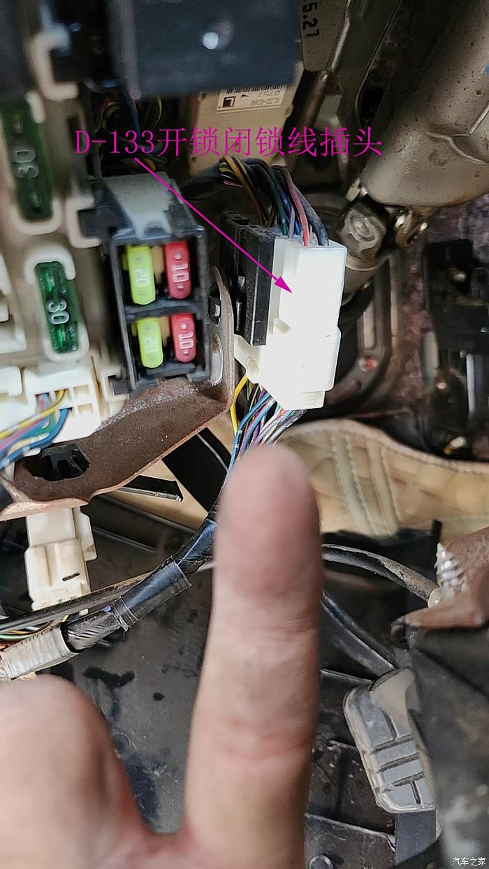 控制器的绿色和白色线接门锁电机的闭锁开锁线。可以接左门内的门锁插头,也可以接中控保险丝旁边的D-133插头
