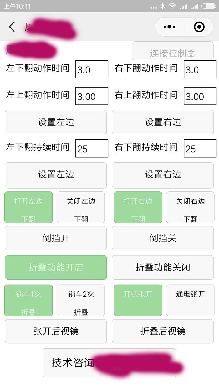 控制器安装后就可以锁车自动折叠,开锁自动张开。如果要设置不同的工作模式。可以用手机设置,微信扫描控制器二维码就可以用小程序设置。手机上可以开启或关闭自动折叠功能。还可以设置锁车1次折叠或在锁车2次折叠。可以设置开锁自动张开后视镜或者通电自动张开后视镜。