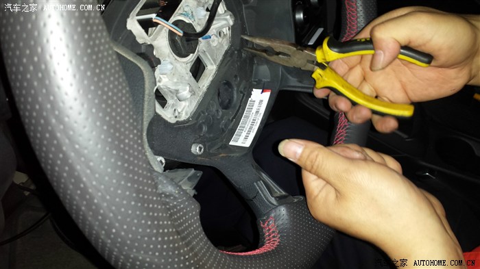 之后开始拆解方向盘卡盒子,分别左右3和9点转方向盘,让卡扣位置露出,拿平口螺丝刀插入并上撬,同时另一只手掰住盒子上端,撬开后拿手套或者毛巾塞入垫住缝隙,防止自行闭合。同样,重复操作另一个方向的卡扣,掰开盒子后,向上提出,后面的那小块直接往胸口方向水平拽出即可。