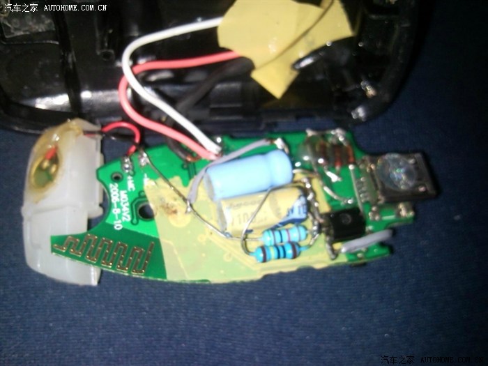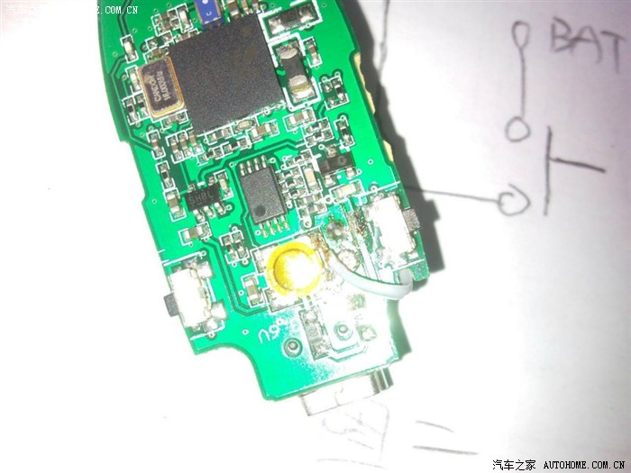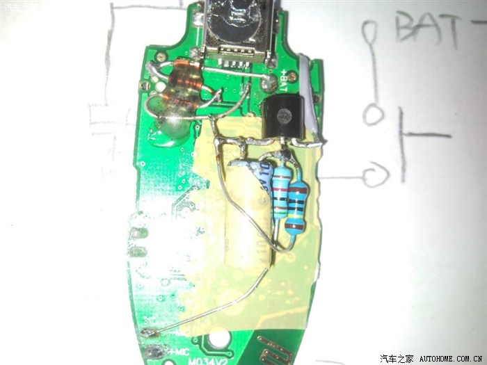 原来放电池的位置加装了个RC三极管延时电路,用来模拟按开机键开机.