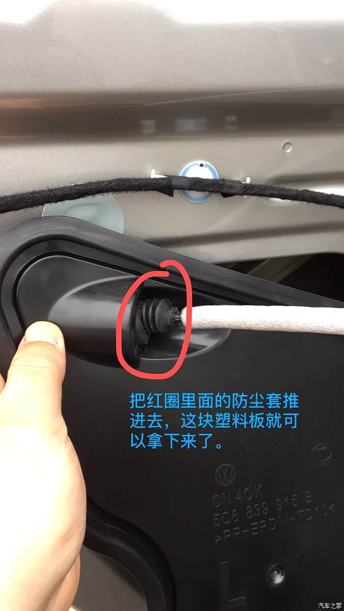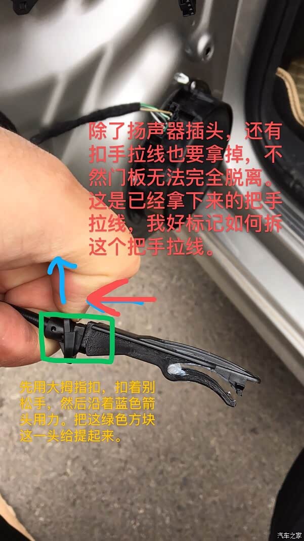 门板上还有门扣手拉线。这个是拆下来的图。本来是固定在车门上的。看我手发力的示意。扣住后把手握住的这端提起来。即可。安装时候,先把右边那头先扣进去后。手握住的这端按下去即可。