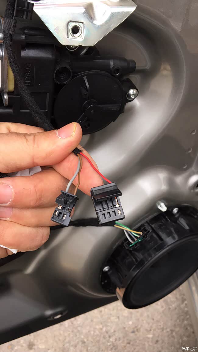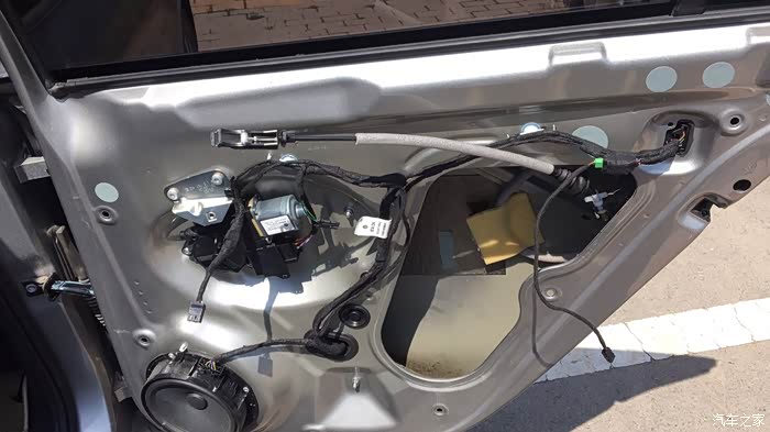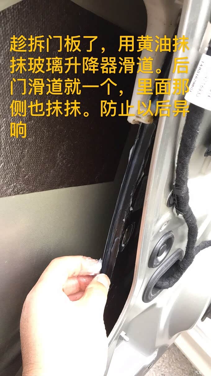 反正拆了,顺便把玻璃升降器轨道抹润滑脂。然后把所有东西安装回去即可。注意:插头都连接后,回装门板时,先把门板挂在车门上。拿住门板两边左右晃动,挂深一点。你看卡扣能对着门板的卡扣孔,就说明挂到位了!