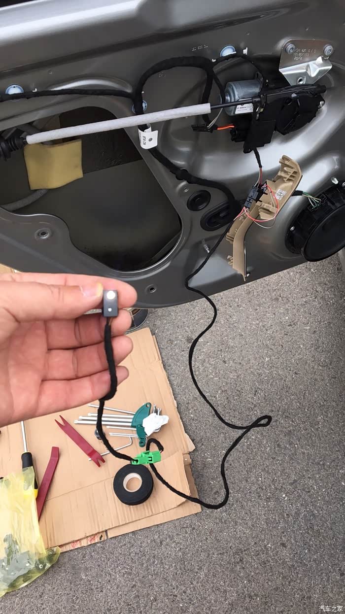 现在把你买的这根转接线用胶带固定在车门原来的那些电线上。看到右边下垂的那个线吗。那就是LED发光头。这个发光头的线留出半米。太短了,拆装别门板都容易拽断,也碍事。