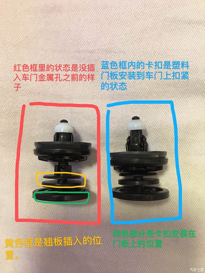 装门板时,保持卡扣这样的状态。然后对准孔,使劲拍。它就扣在车门上了。所有卡扣活动部位抹黄油。下次拆门板就不那么费力了。