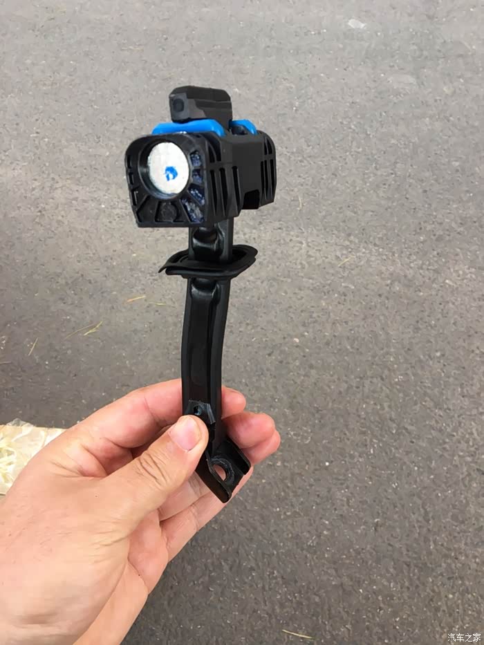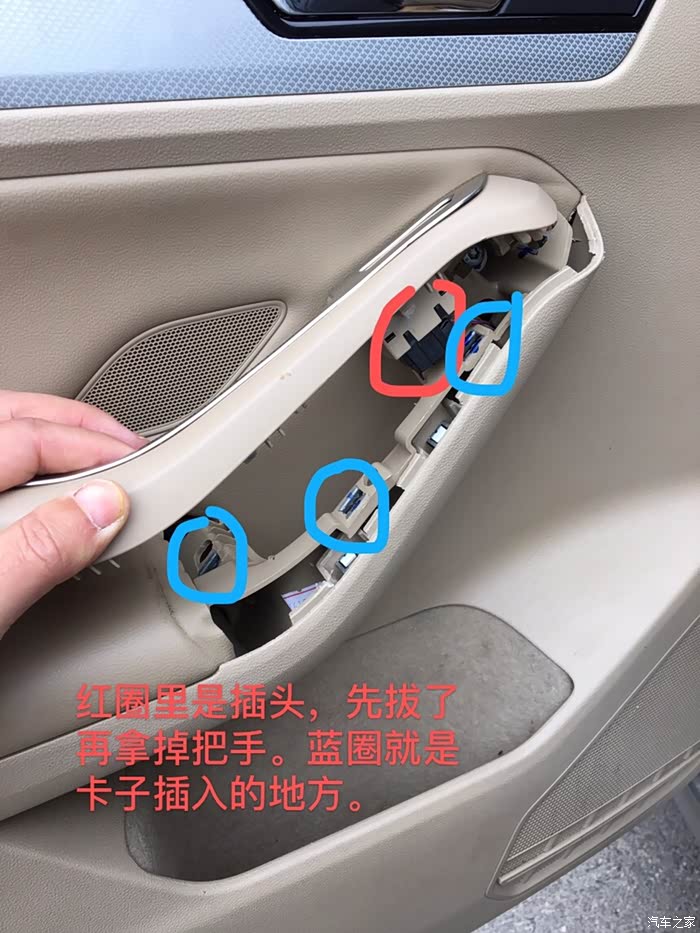 这就是撬开的样子。看到蓝圈金属卡子所在塑料了吗?所以撬把手时候,翘板别撬错地方了。撬开后,注意有个插头。得拔了。