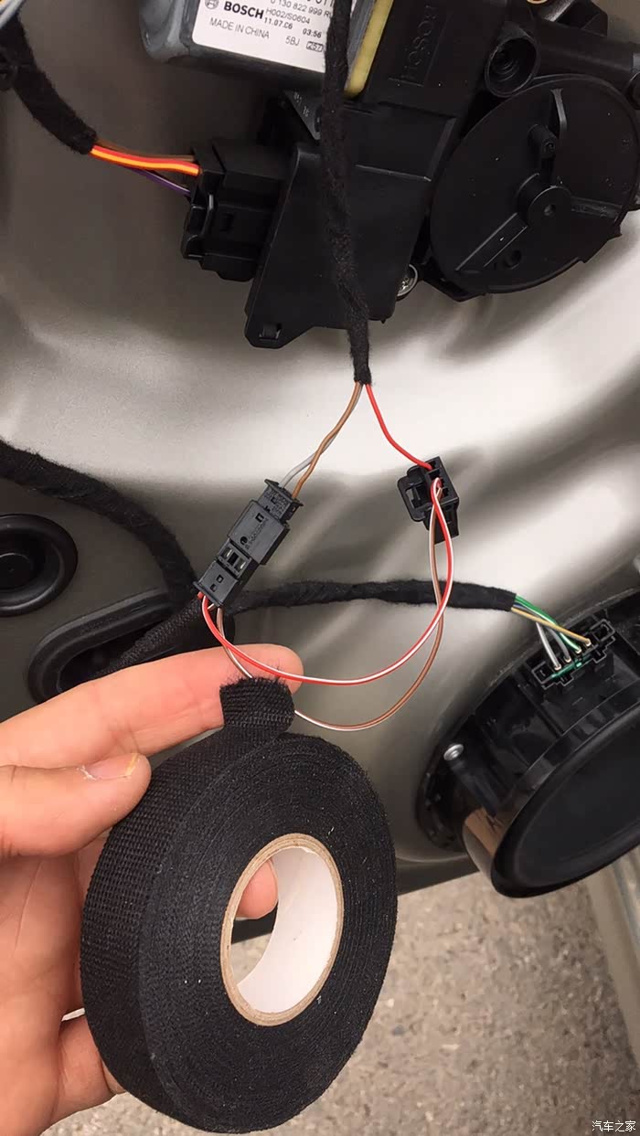 跳完线后,以这种姿态缠胶带。这样的话,那个升降器插头就可以挺长,也不粗了。 便于安装时穿过门板。