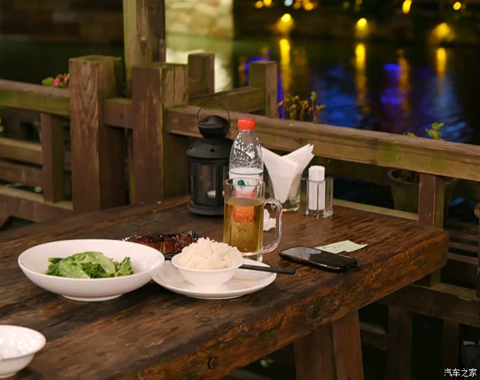 排了半个小时的队,总算是临河而坐了。一盘乌镇酱鸭、一盘炒生菜、一杯啤酒一碗饭,90元。