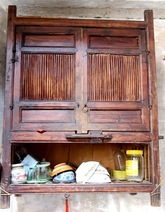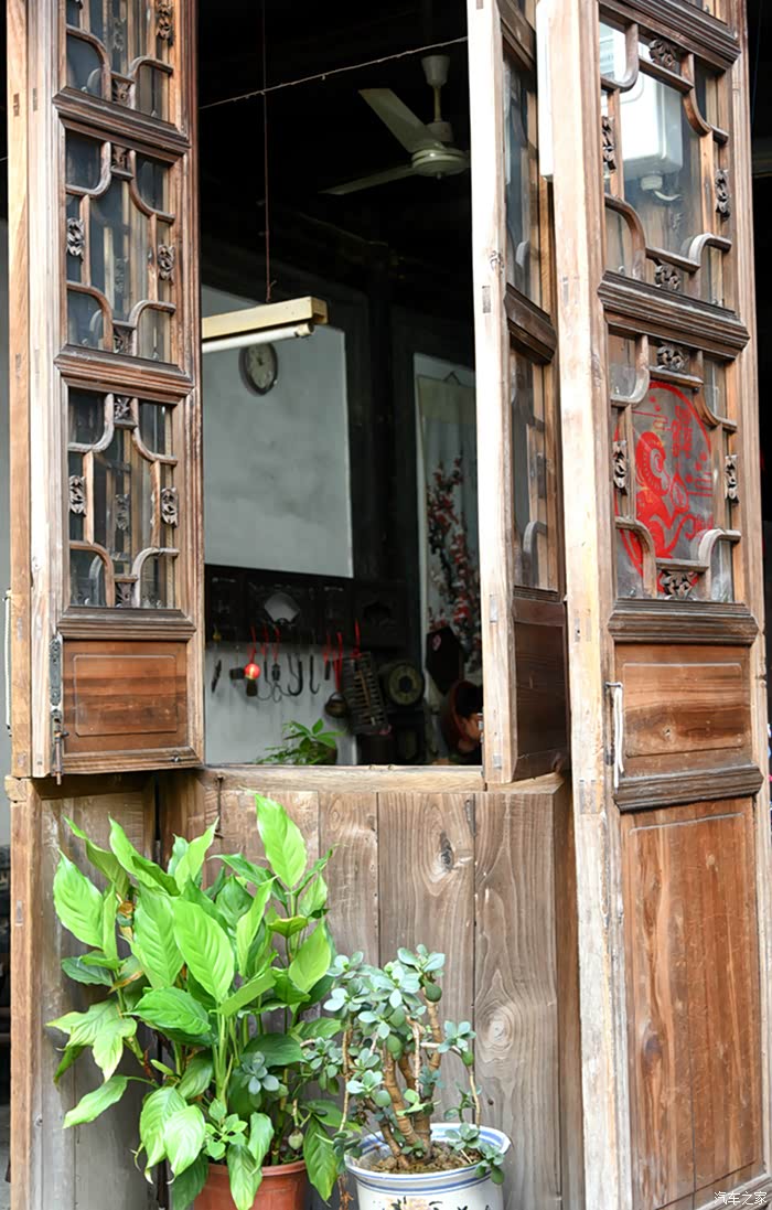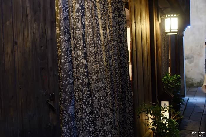 小巷内人家,敞开的大门被一块蓝印花布遮挡着,当风把蓝印花布掀起时,可以看见一家人正围坐在一起吃着晚饭。
