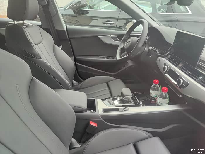 同样奥迪A5L也没有和奥迪A6L一样拥有两块大联屏,倒是和奥迪A4L有点像,屏幕都不是很大,不知道是不是为了显得更加运动的关系哈哈。杯架可以同时放下两瓶矿泉水,但是和奥迪A4L一样会有点挡住按键操作不是很方便。