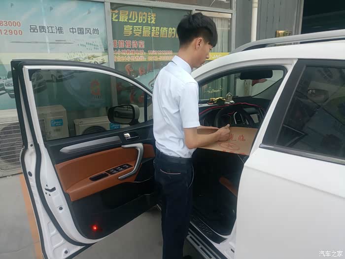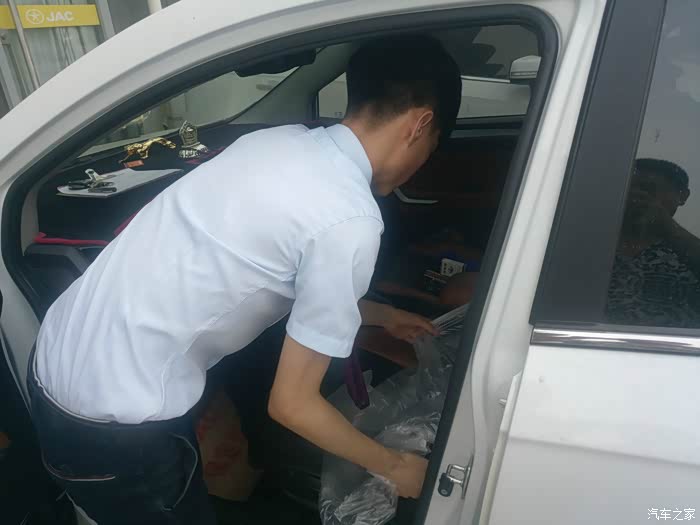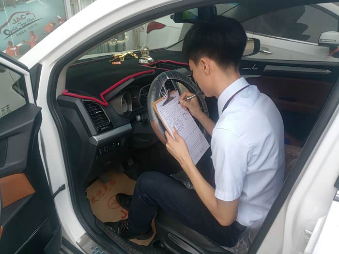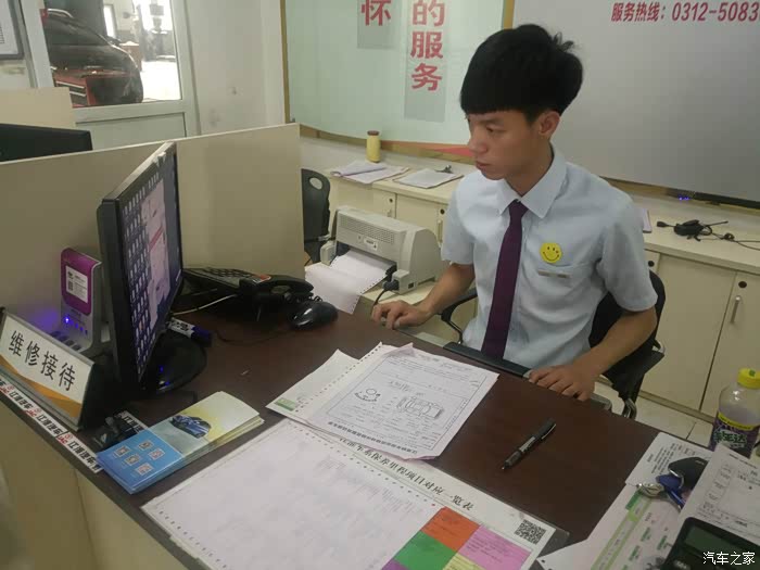 进入接待室内,接待员开始登记相关信息,铺脚垫,座垫,录入车辆资料,环车检查一气呵成