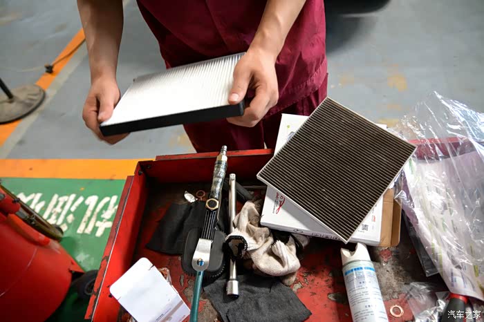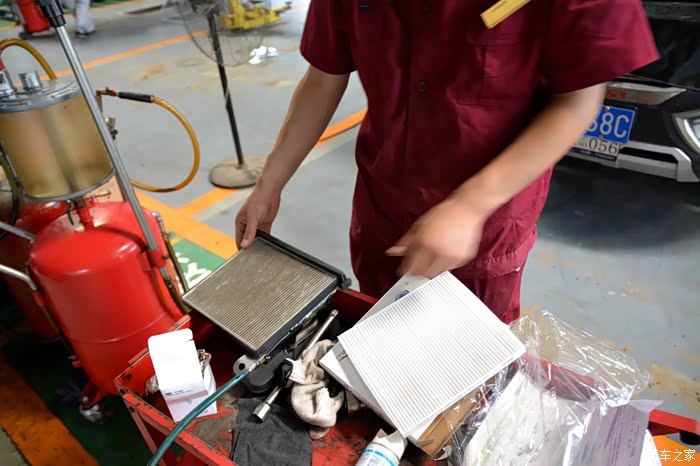 机油滤清器、特级机油、空调滤网,空气滤清器,进气清洗,空调清洗一切准备就绪,看着维修小哥开工喽。