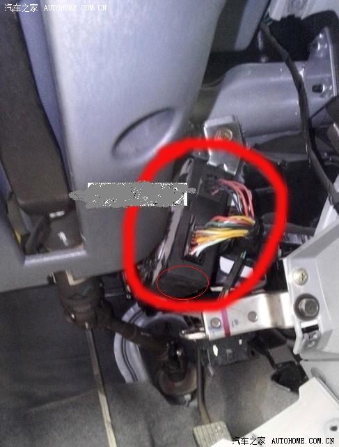 3.在汽车上找到遥控器接收器,无须打开方向盘下的塑料盖板,通过中间的一个孔,能够将铁丝顶到主机(红色大圈)的小孔。