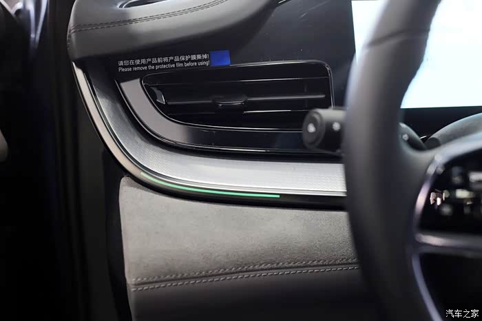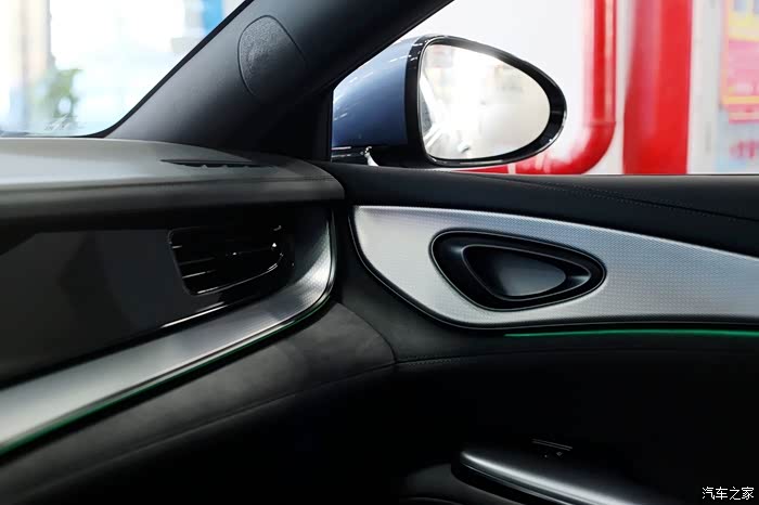 车内有31色流水环绕式氛围灯,光影流转,效果不错。照片上车门那一条好看的荧光绿色就是氛围灯,会不停变换颜色。