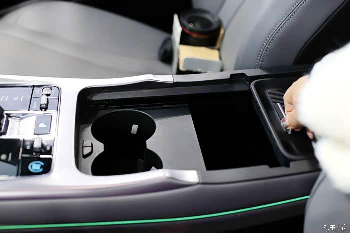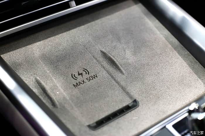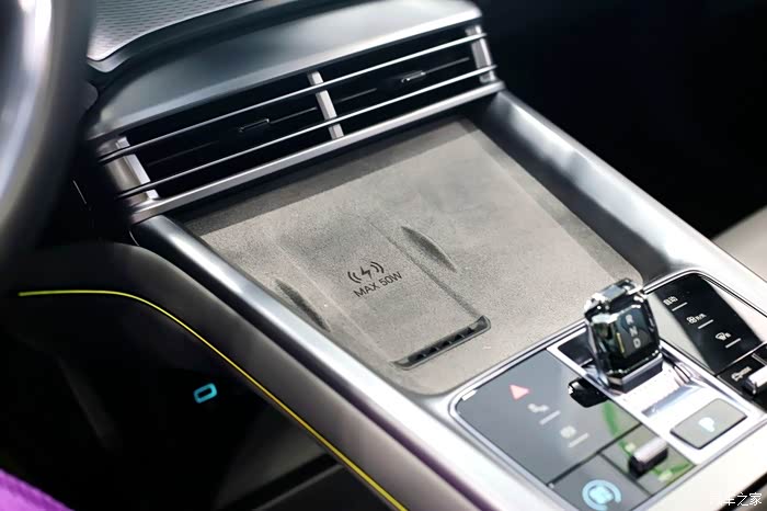 电子挡杆水晶材质的运用更是提升了车内质感,造型小巧精致,而且四周采用较为规整的圆角矩形设计,摸上去不会有割手感,细节打磨很到位。挡把区域前方设置了双手机槽,其中左侧还支持最大50W的快充功能,并配备了风冷散热装置。