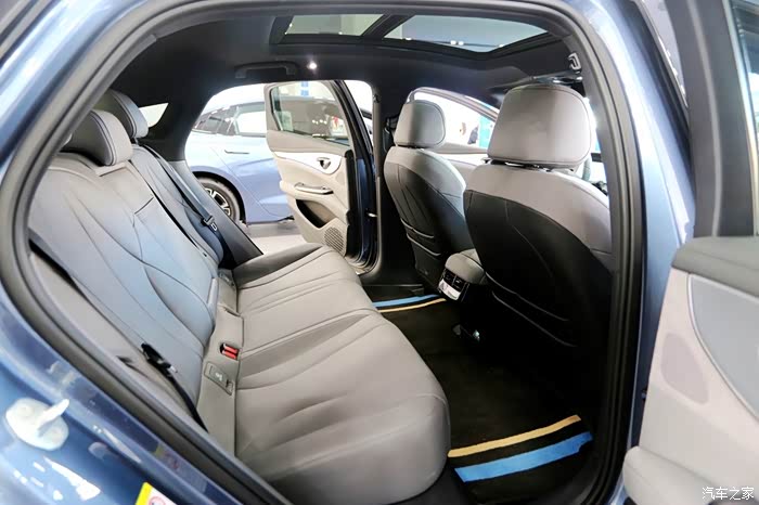 后排座椅填充厚实,坐垫够长,能够对身体和大腿部位起到很好的承托,坐上去很像是自家的沙发一般,腿部空间能有2拳半的距离,可以翘起二郎腿,并排坐满3名身材偏胖的成年人,横向空间不会拥挤,另外前排侧窗使用了多层隔音玻璃,后排侧窗刚刚提到了,是隐私玻璃。