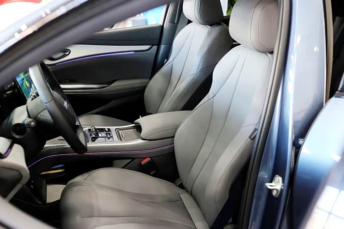 海豹07DM-i的座椅使用了更注重舒适的环抱式座椅设计,造型宽大,而且采用了双拼色设计配合立体缝线。