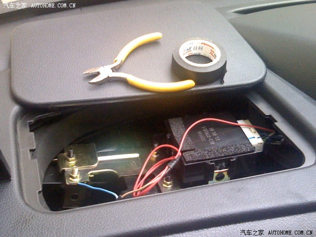 喇叭的正极(棕色线)与先前引出的锁车线对接,负极(蓝色线)就近搭铁。其实还可以用单支的电线穿到发动机舱里接喇叭正极,而喇叭的负极在机舱里就近搭铁。