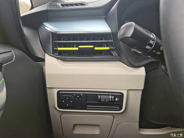 驾驶座椅的前方空调通风口也采用了荧光黄的装饰更加醒目,下方的操控按键也充满质感,方向盘左下方的转向灯,雾灯等各种灯源的操控也很方便,在手不离方向盘的状态下就可以操控
