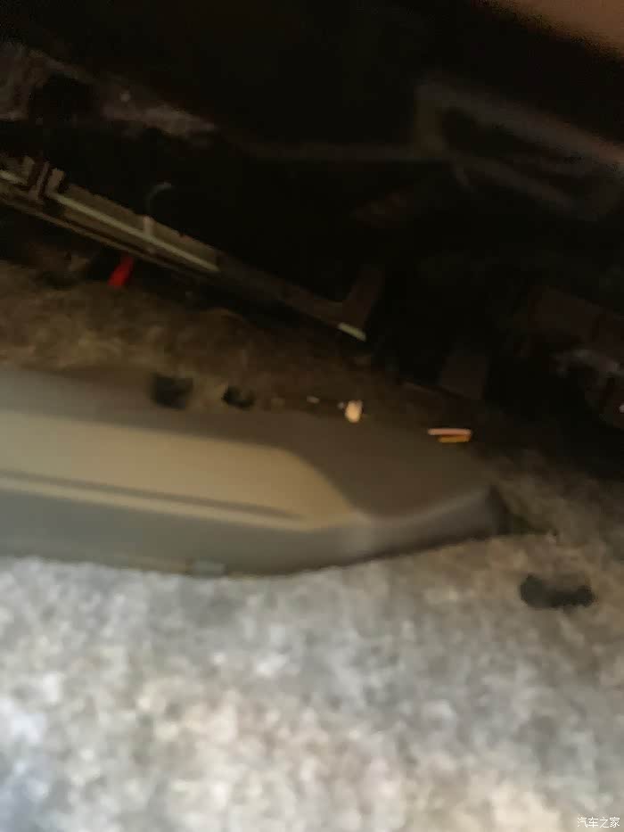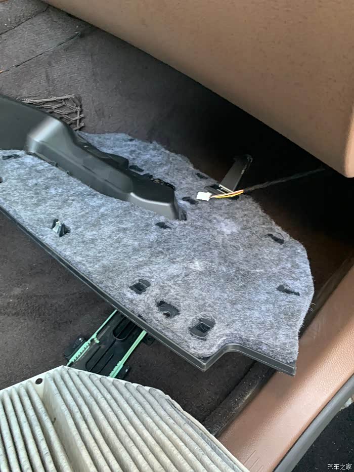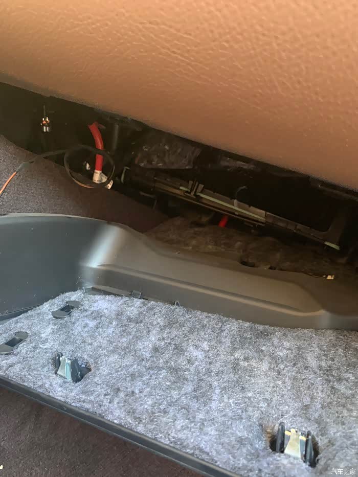 要先吧副驾驶座椅移到最后,在手套箱下面又个盖板需要卸下来,盖板上就一个螺丝拧下来,剩下的都是卡子,一拉就下来,这就是拆下盖板的样子
