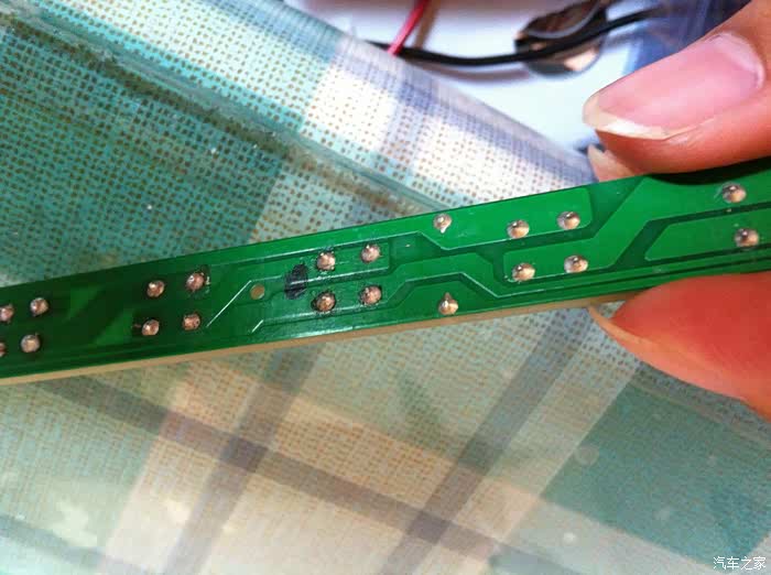 拆、焊灯珠时候用的都是双手,没有手拍照片了,所以没有过程图片。小技巧就是:拆灯珠的时候同一侧的2个焊点一起熔,同时另一只手这侧2个引脚拉出,然后再熔另一侧的焊点拉出整个灯珠。因为灯珠是4个引脚的,逐个引脚去熔的话引脚拉不出来(另外3个固定着呢)。电烙铁一离开焊点,焊点马上就凝固了,所以2个焊点一起熔的时候速度要快。