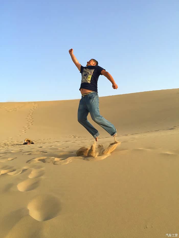 这坡度看起来有45度啊,我们就是这样走下去的,但是下坡很放心,完全不担心滚下去,腿陷在沙子里40公分,比普拉多的四驱都管用。