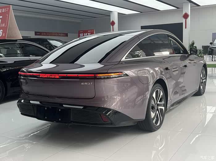 一进店就看到了一黑一紫两台星海S7。哪怕是作为星海S7的老车主,从外观上第一眼也没能把增程版和纯电版分清。最后还是店里的小哥告诉我,想要最快判断是否是增程的方法就是看车尾,有两个盖口的是增程版,只有一个盖口的是纯电版。