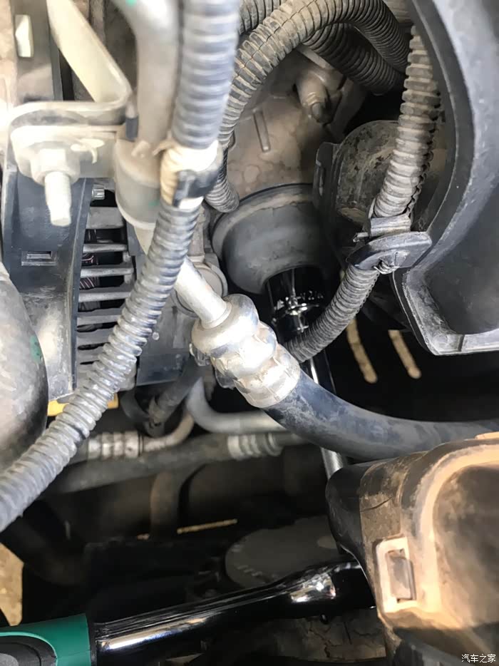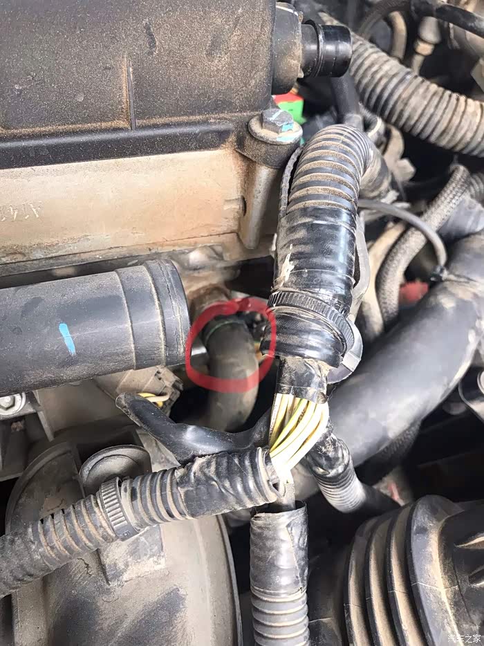 回到老家,准备开始做保养(换机油),刚打开引擎盖,就听到哪在漏气,来自于发动机,打开护板,在保险盒附近尤为明显,思来想去难道是防冻液漏了?没报警啊,于是检查添加防冻液的壶,摇了几下没看到防冻液晃动,遭了,壶里的防冻液漏光了。心想这才五年不到,发动机上的出水管怎么会破裂的呢?没办法,坏了就得修,联系了一个朋友来给我修车。一个小插曲,幸好今天做保养,不然不知道拖到哪天,问题就大了。