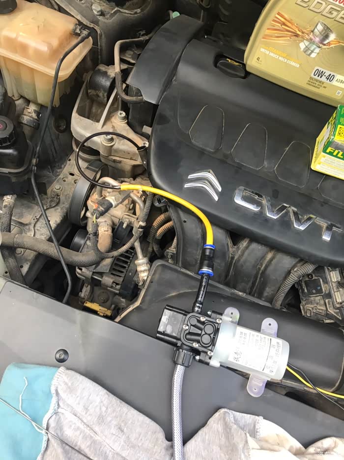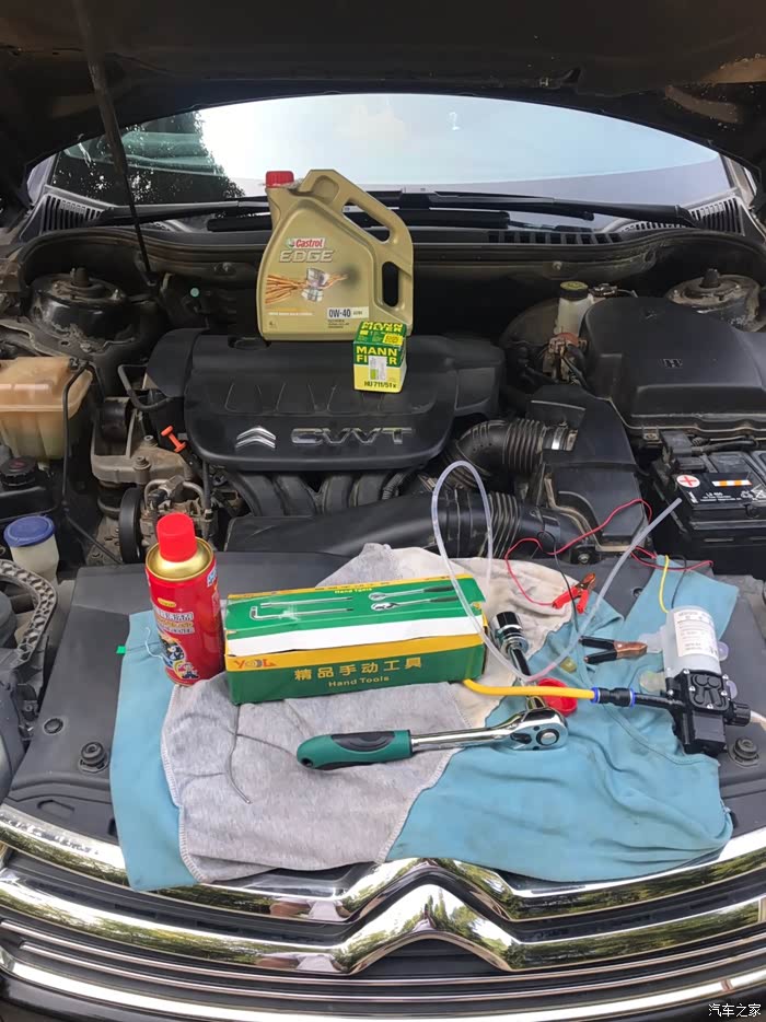扭开机油加注口盖,拔掉机油尺,从机油尺孔插入管子直接抽。小抽油泵直接接电瓶,还蛮方便的
