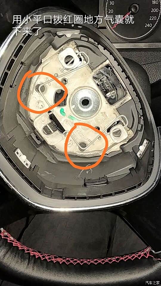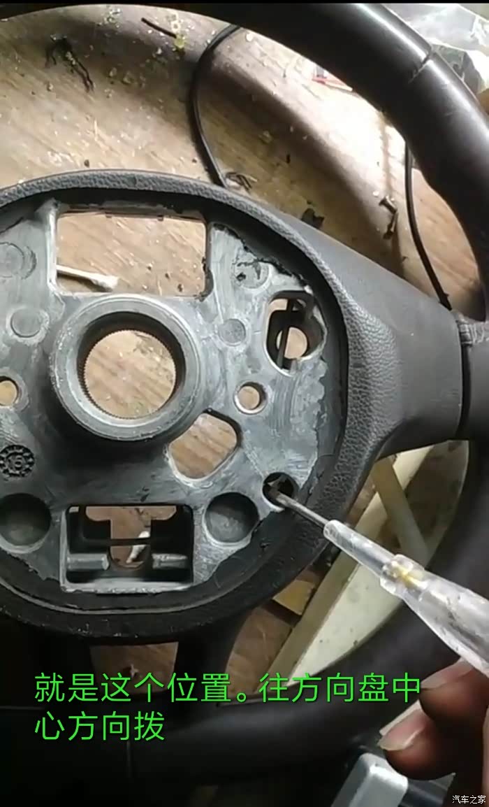 从方向盘背面用小平口拨这两个孔的铁条就可以